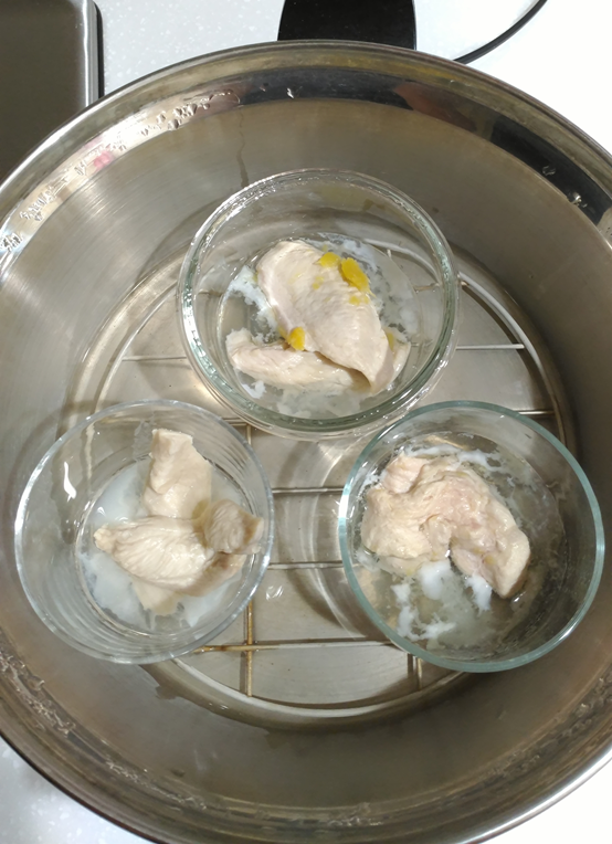 實驗組的方法,明顯有感覺到雞胸肉有比較軟一點,也發現在比較厚的部位會有些微的血水,所以可能這個方法沒有把肉完全的煮熟。所呈現的軟嫩是因為肉還是生的。