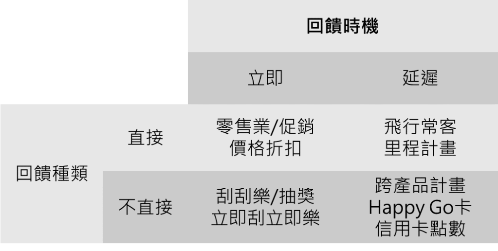 回饋時機很容易理解,是否在消費當下消費者就可以得到回饋。